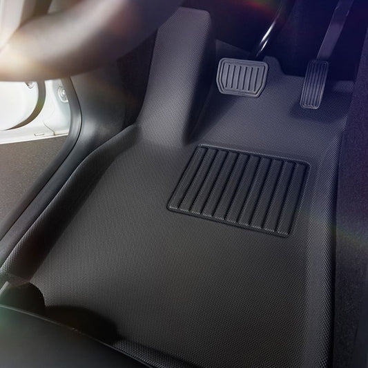 The mats are specifically crafted to fit the contours of the Model 3 and Model Y, ensuring full coverage and preventing any movement during use.